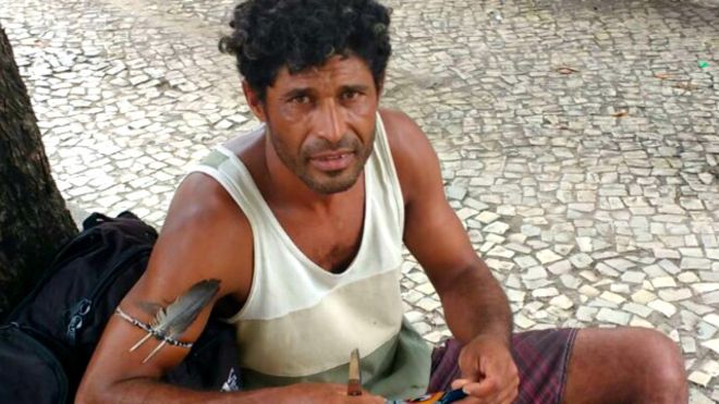 Um índio da tribo krenak, cujos membros vivem principalmente entre os Estados de Minas Gerais e Espírito Santo, dorme há um mês ao relento numa praça movimentada de Ipanema, no Rio de Janeiro.