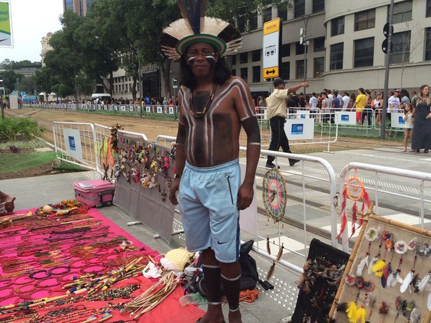 Este sábado (20) foi o segundo dia deles na Zona Portuária do Rio. Os índios afirmaram que estavam adorando o assédio do público, que pedia para tirar fotos e compravam seus trabalhos. :: LEIA MAIS »