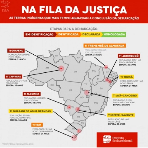 A demora na homologação de demarcações pelo governo de Michel Temer e o desmonte da Funai deixam 223 terras indígenas vulneráveis a conflitos com fazendeiros, a reintegrações de posse e crimes ambientais. De acordo com a nota técnica do Instituto Socioambiental (ISA), ao todo são mais de 9 milhões de hectares em estado de alerta diante de possíveis retrocessos na demarcação devido a 42 projetos de infraestrutura e outros 193 processos relativos a mineração previstos para áreas inseridas em 46 terras indígenas que ainda não foram homologadas.