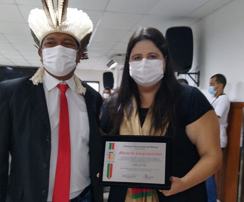 Na foto o vereador indígena Cláudio Magalhães, e Aline Costa, coordenadora do Materno infantil, recebendo a homenagem da Câmara de vereadores de Ilhéus. Foto: Walney Magno