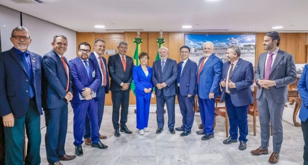 O presidente lula e do governador Jerônimo Rodrigues, com a vice-presidenta global da BYD, Stella Li, em Brasília. Foto: Rede social